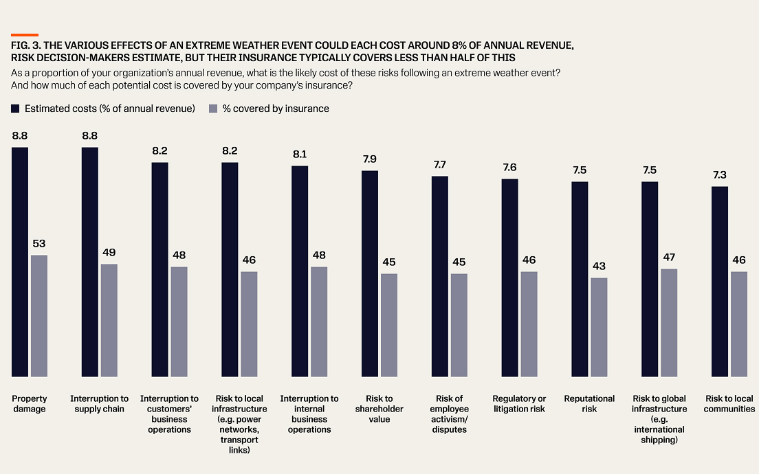 Insurance is, of course, a vital tool in mitigating the potential financial impact of extreme weather events. But our survey respondents report that their current insurance policy covers less than half of the potential cost of extreme weather’s various effects, aside from property damage (see Fig. 3).